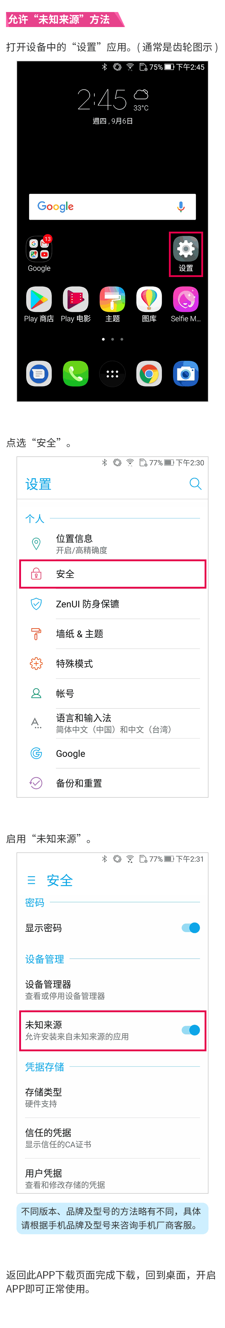 步骤三设置 > 安全 > 启用 "未知来源" > 安装 APP